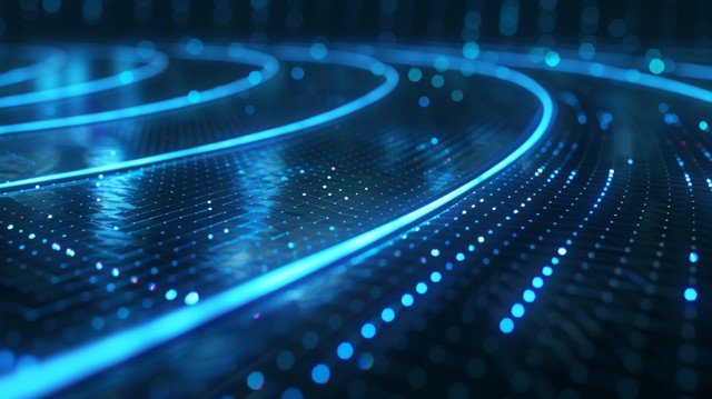 带有蓝色和橙色灯光的数字网格背景,代表虚拟现实或未来技术的概念。