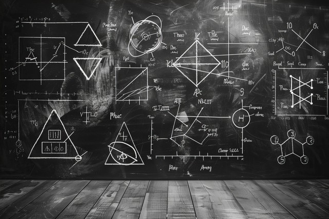 一块黑板,上面画着数学方程和几何形状。