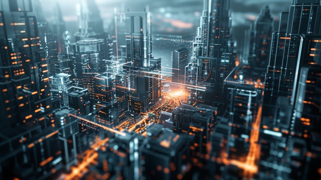 3D 渲染技术数字背景,由带有数据的未来城市组成