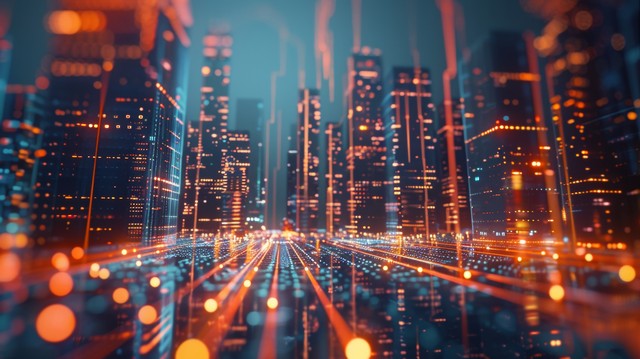 3D 渲染技术数字背景,由带有数据的未来城市组成