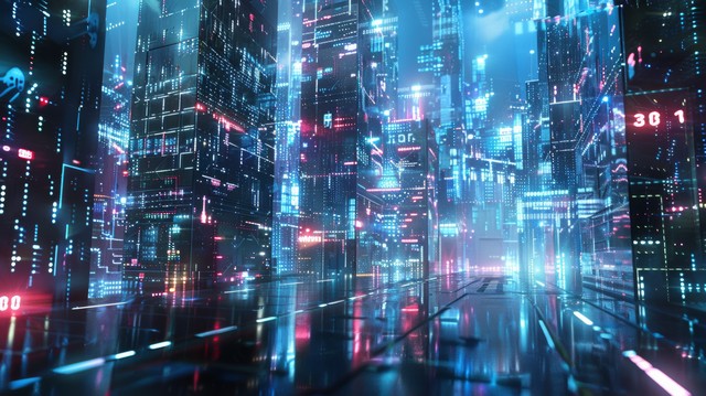 3D 渲染技术数字背景,由带有数据的未来城市组成
