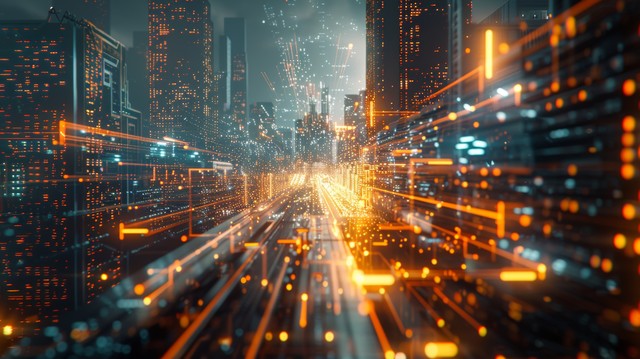 3D 渲染技术数字背景,由带有数据的未来城市组成