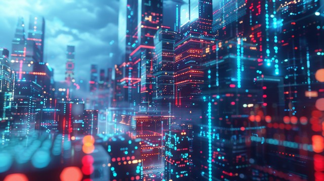 3D 渲染技术数字背景,由带有数据的未来城市组成