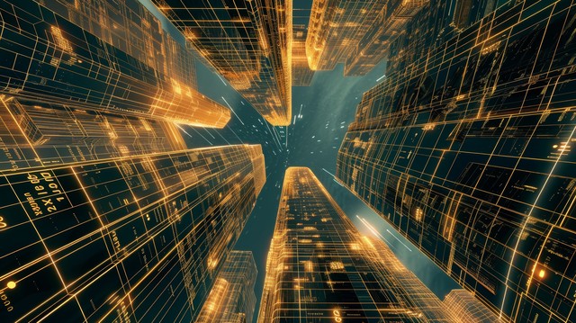 3D 渲染技术数字背景,由带有数据的未来城市组成