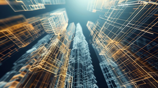 3D 渲染技术数字背景,由带有数据的未来城市组成