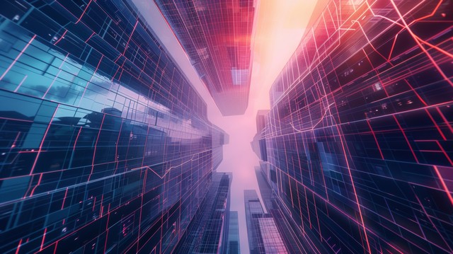 3D 渲染技术数字背景,由带有数据的未来城市组成