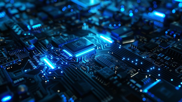 抽象技术黑色背景。 未来数字主板纹理。 霓虹蓝光