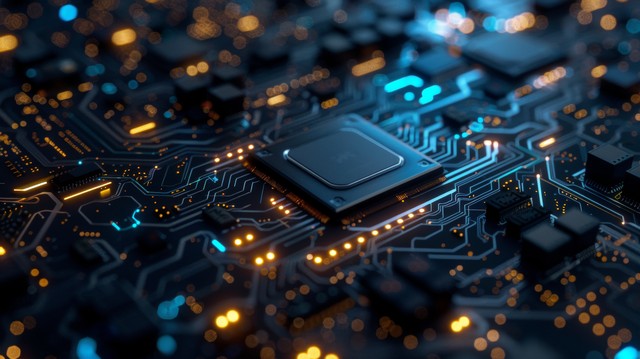 抽象技术黑色背景。 未来数字主板纹理。 霓虹蓝光
