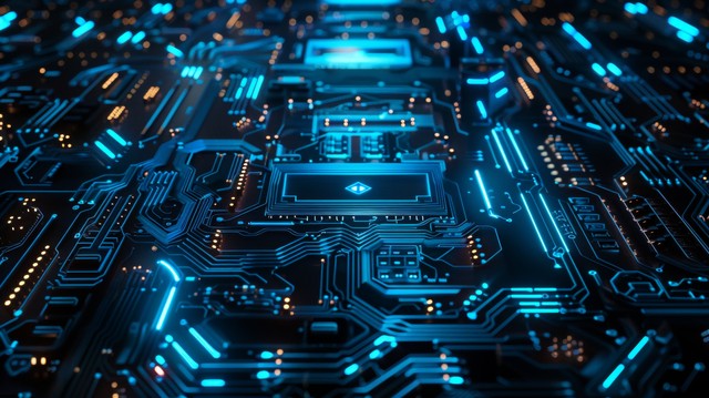 抽象技术黑色背景。 未来数字主板纹理。 霓虹蓝光