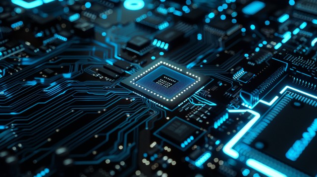 抽象技术黑色背景。 未来数字主板纹理。 霓虹蓝光