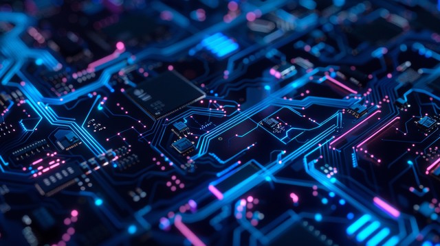 抽象技术黑色背景。 未来数字主板纹理。 霓虹蓝光