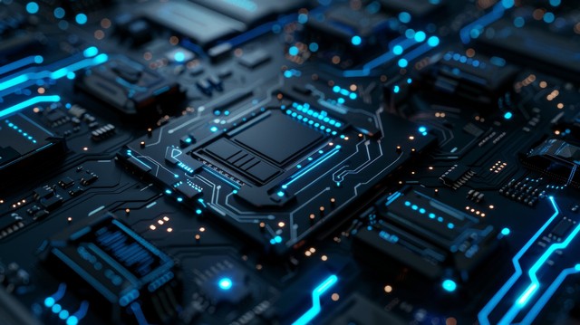 抽象技术黑色背景。 未来数字主板纹理。 霓虹蓝光