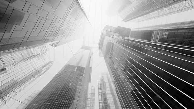 线条和数字元素进行抽象 3D 城市渲染。 具有电线纹理的数字摩天大楼。 技术和连接概念。 透视建筑