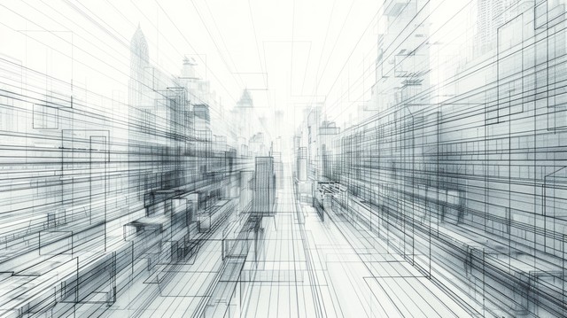 线条和数字元素进行抽象 3D 城市渲染。 具有电线纹理的数字摩天大楼。 技术和连接概念。 透视建筑