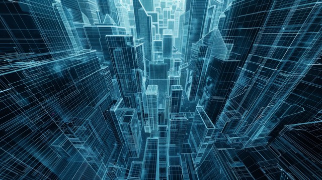 线条和数字元素进行抽象 3D 城市渲染。 具有电线纹理的数字摩天大楼。 技术和连接概念。 透视建筑