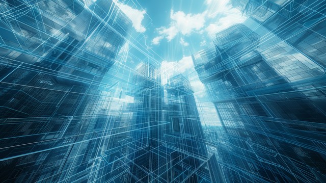 线条和数字元素进行抽象 3D 城市渲染。 具有电线纹理的数字摩天大楼。 技术和连接概念。 透视建筑