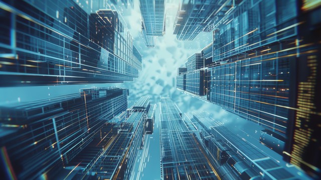 线条和数字元素进行抽象 3D 城市渲染。 具有电线纹理的数字摩天大楼。 技术和连接概念。 透视建筑背