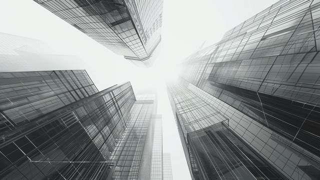 线条和数字元素进行抽象 3D 城市渲染。 具有电线纹理的数字摩天大楼。 技术和连接概念。 透视建筑背