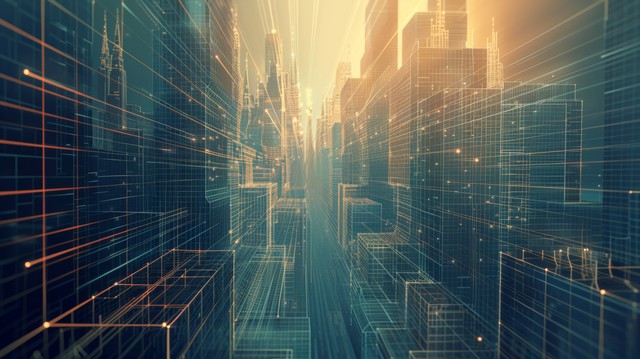 线条和数字元素进行抽象 3D 城市渲染。 具有电线纹理的数字摩天大楼。 技术和连接概念。 透视建筑背