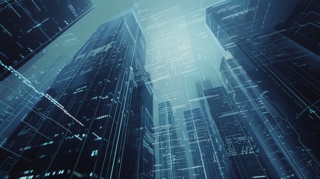 线条和数字元素进行抽象 3D 城市渲染。 具有电线纹理的数字摩天大楼。 技术和连接概念。 透视建筑背