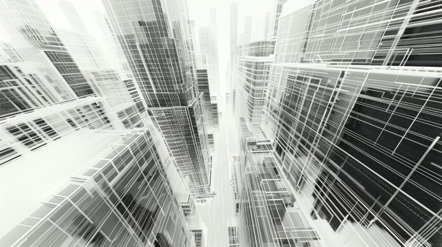 线条和数字元素进行抽象 3D 城市渲染。 具有电线纹理的数字摩天大楼。 技术和连接概念。 透视建筑背