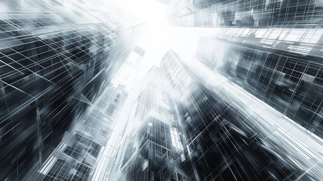 线条和数字元素进行抽象 3D 城市渲染。 具有电线纹理的数字摩天大楼。 技术和连接概念。 透视建筑背