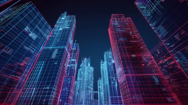 线条和数字元素进行抽象 3D 城市渲染。 具有电线纹理的数字摩天大楼。 技术和连接概念。 透视建筑背