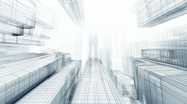 线条和数字元素进行抽象 3D 城市渲染。 具有电线纹理的数字摩天大楼。 技术和连接概念。 透视建筑背