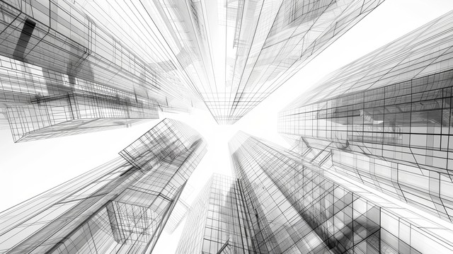 线条和数字元素进行抽象 3D 城市渲染。 具有电线纹理的数字摩天大楼。 技术和连接概念。 透视建筑背