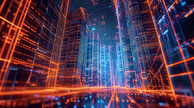 使用线条和数字元素进行抽象 3D 城市渲染。 具有电线纹理的数字摩天大楼。 技术和连接概念。 透视建