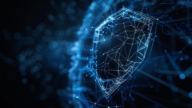 盾牌。 深蓝色的抽象线框插图。 保护和安全概念。 抽象技术背景上的数字盾。
