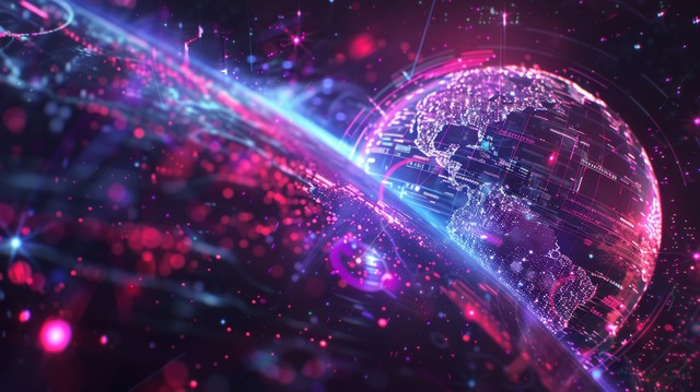 User 未来企业在数字空间 3D 渲染背景下投资世界网络技术,丰富多彩的全球与互联网和技术概念