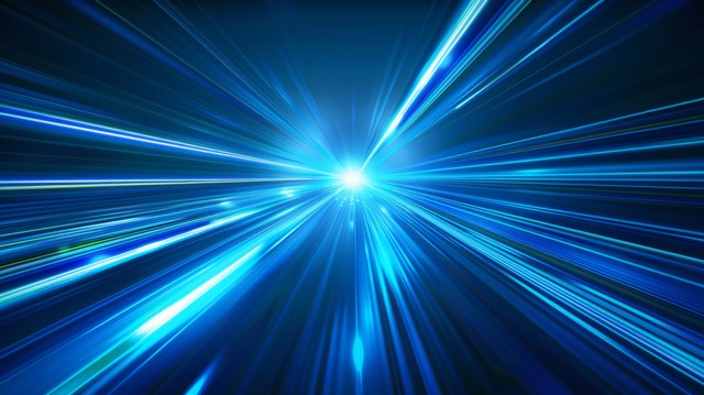 矢量抽象、科学、未来、能源技术概念。 深蓝色背景上的光线、蓝光条纹、速度和运动模糊的数字图像