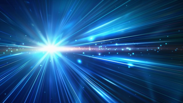 矢量抽象、科学、未来、能源技术概念。 深蓝色背景上的光线、蓝光条纹、速度和运动模糊的数字图像