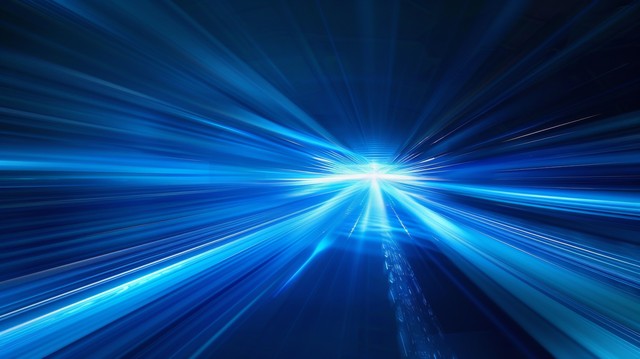 矢量抽象、科学、未来、能源技术概念。 深蓝色背景上的光线、蓝光条纹、速度和运动模糊的数字图像