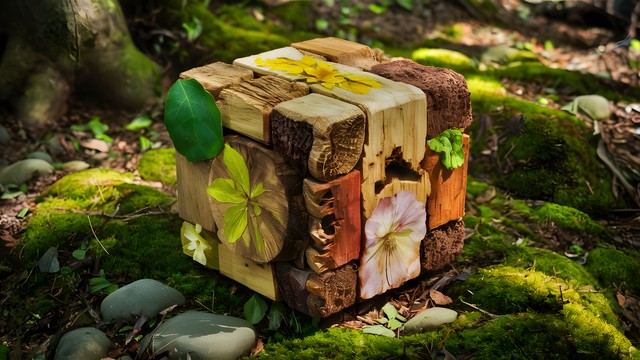 一张由自然元素混合而成的立体立方体的迷人照片。