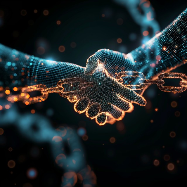 暗色背景上的抽象数字握手,配以发光的线条和点,营造出一种利用区块链技术开展业务合作的氛围