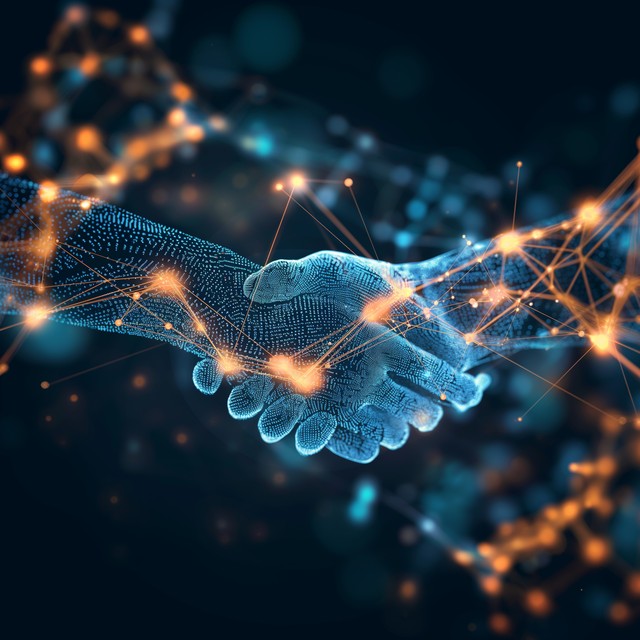 暗色背景上的抽象数字握手,配以发光的线条和点,营造出一种利用区块链技术开展业务合作的氛围