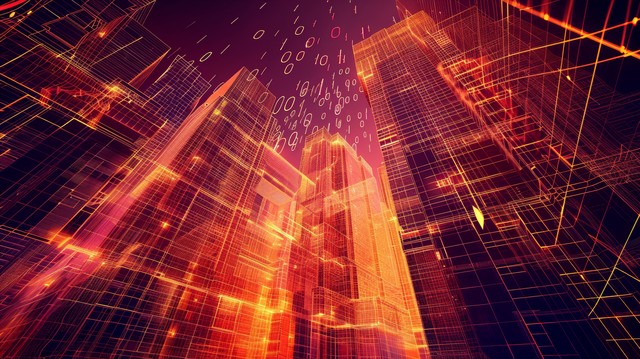 使用线条和数字元素进行抽象 3D 城市渲染。 具有线框纹理和随机数字的摩天大楼。 技术和连接概念。
