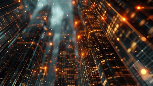 使用线条和数字元素进行抽象 3D 城市渲染。 具有线框纹理和随机数字的摩天大楼。 技术和连接概念。