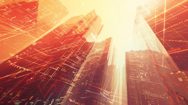 使用线条和数字元素进行抽象 3D 城市渲染。 具有线框纹理和随机数字的摩天大楼。 技术和连接概念。