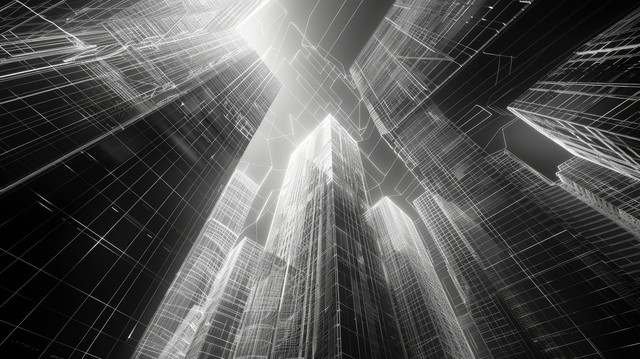 使用线条和数字元素进行抽象 3D 城市渲染。 具有线框纹理和随机数字的摩天大楼。 技术和连接概念。
