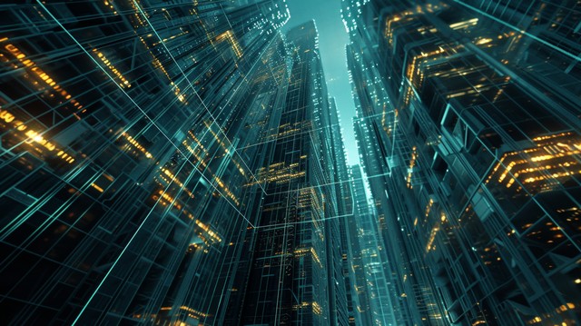 使用线条和数字元素进行抽象 3D 城市渲染。 具有电线纹理的数字摩天大楼。 技术和连接概念。