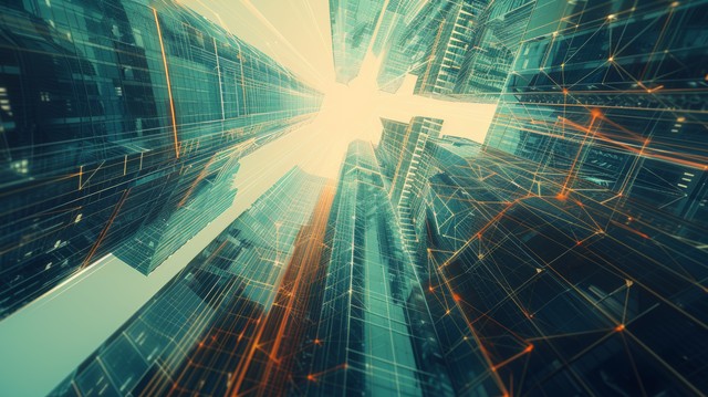 使用线条和数字元素进行抽象 3D 城市渲染。 具有电线纹理的数字摩天大楼。 技术和连接概念。