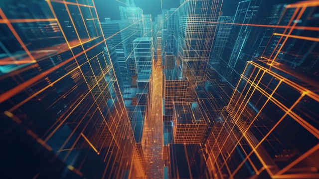 使用线条和数字元素进行抽象 3D 城市渲染。 具有电线纹理的数字摩天大楼。 技术和连接概念。