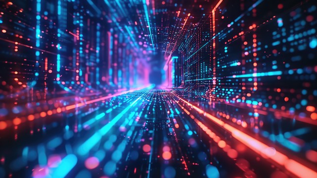 数字技术。高速数据传输。 3D 插图中的信息流。未来霓虹灯网络空间中的运动