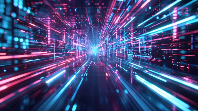 数字技术。高速数据传输。 3D 插图中的信息流。未来霓虹灯网络空间中的运动