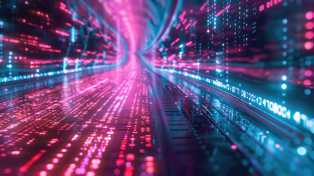 数字技术。高速数据传输。 3D 插图中的信息流。未来霓虹灯网络空间中的运动