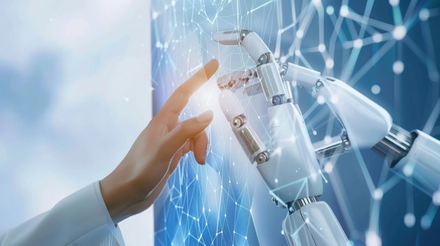 人工智能机器学习——全球网络连接的机器人和人类触摸大数据之手——互联网和数字技术——未来的科学和人工