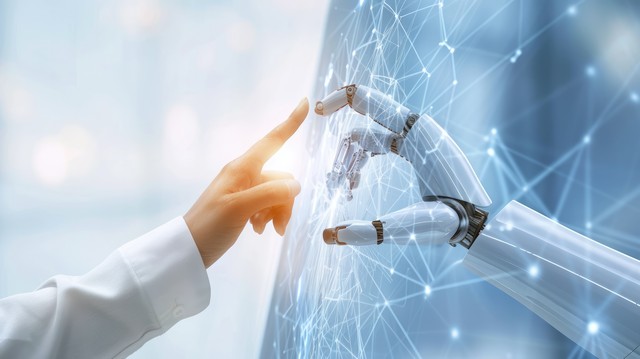 人工智能机器学习——全球网络连接的机器人和人类触摸大数据之手——互联网和数字技术——未来的科学和人工
